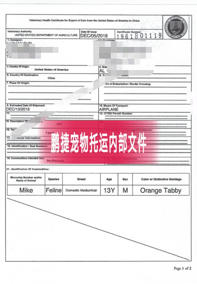 美国农业部(USDA)出具的动物卫生证书并盖政府部门印章,文件有效期为14天。